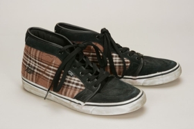 Gördeszkás cipő. Vox márkanéven készült. Mamusz-szerű, magasszárú, fekete velúr orrésszel és fehér-barna kockás textil oldal és hátsó felülettel. Fehér gumitalppal. A kockás textil részen hímzett márkajelzés található. Hordott, de nem rossz állapotú.