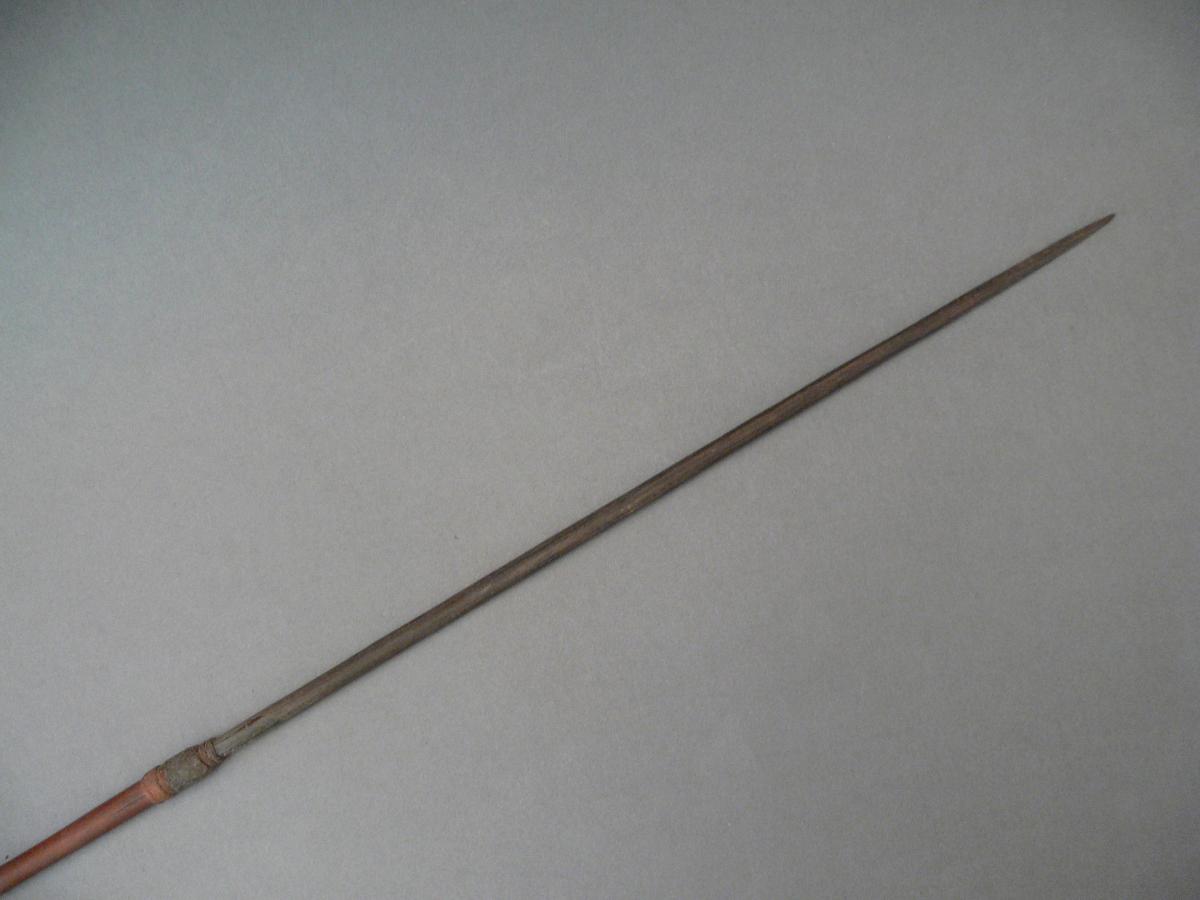Kétrészes: nyele barnás színű, hengeres nád, hegye feketés színű, hengeres keményfa. A két rész illeszkedésénél feketés színű aszfaltszerű anyag van, fölötte és alatta különböző szélességű, barnás színű, két-két fonott gyűrű van. A nyél felső vége repedt. Díszítetlen.