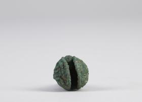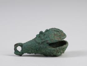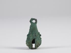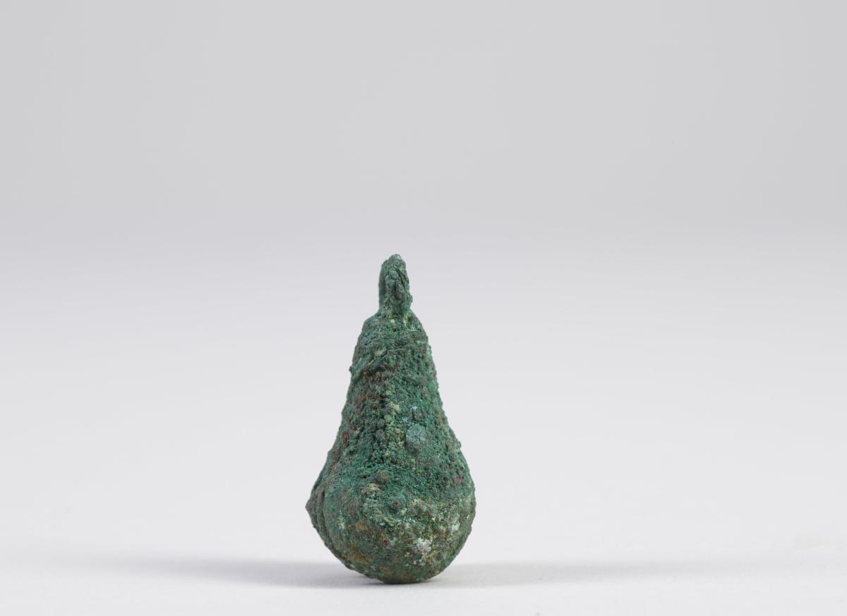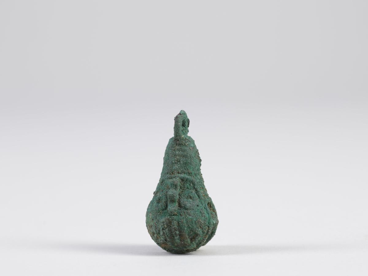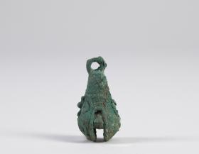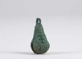 Vízcsepp alakú üreges rézcsörgő. Alsó, szélesebbik részén téglalap alakú nyílást hagytak a csörgőbe helyezett rézgömb keltette hang felerősítésére. A tárgy felső végén felfüggesztésre szolgáló gyűrű található. A csörgőtest egyik oldalán domborműszerűen arcot alakítottak ki. Gyűrű alakú szemei, kiemelkedő orra, és a szájából lefelé induló kígyószerű vonalak alapján a közép-mexikói esőistent Tlalocot ábrázolja. Ennek alapján a csörgő valamilyen vízzel, illetve Tlaloc-kal kapcsolatos szertartás kelléke lehetett.