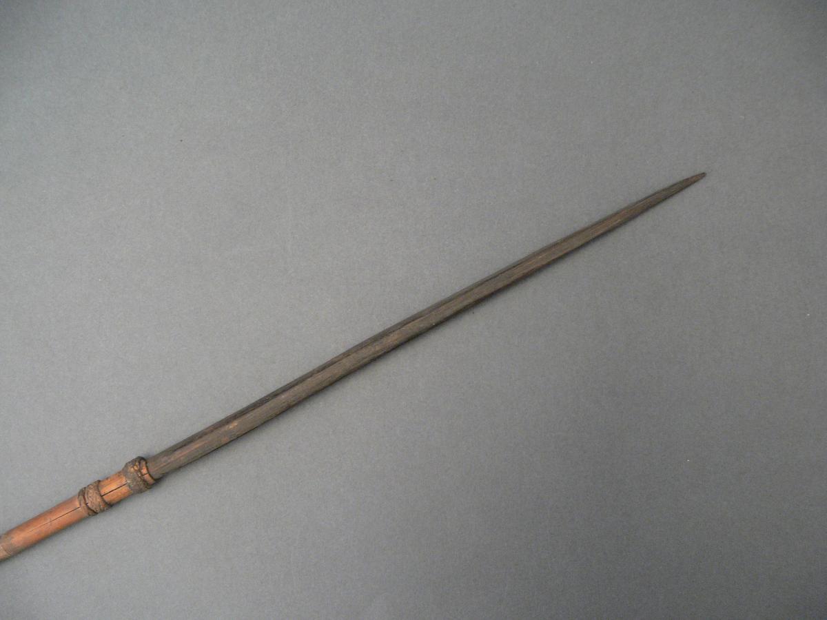 Kétrészes: nyele barnás színű, hengeres nád, hegye szögletes, négyélű, feketés színű keményfa. A két rész illeszkedésénél két különböző szélességű barnás színű, fonott gyűrű van, ezek fölött sötét színű, aszfaltszerű anyag ugyancsak fonott gyűrűt fed. Díszítetlen.