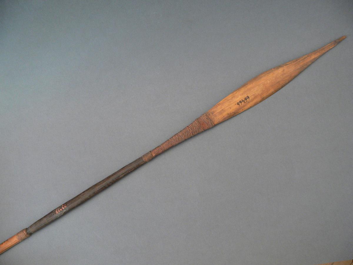 Háromrészes: nyele sárgás-barnás színű, hengeres nád, hegye ugyanilyen színű, sáslevél alakú, hasított bambusz. Középrésze barnás színű, hengeres keményfa. A hegy a középrészre pirosas színű fonadékkal van felerősítve, a nyél és a középrész illeszkedésénél pedig barnás színű, fonott háncsgyűrű van. A nyél felső részén repedt. Díszítetlen.