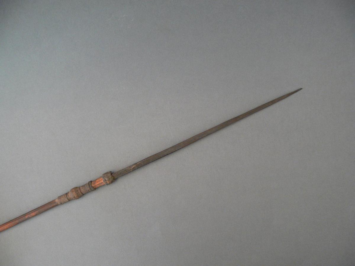 Kétrészes: nyele barnás színű, hengeres nád, hegye szögletes, négyélű, feketés színű keményfa. A két rész illeszkedésénél feketés színű, aszfaltszerű anyaggal bevont fonadék, ez alatt különböző szélességű és formájú, barnás színű, fonott háncsgyűrűk vannak. Díszítetlen.