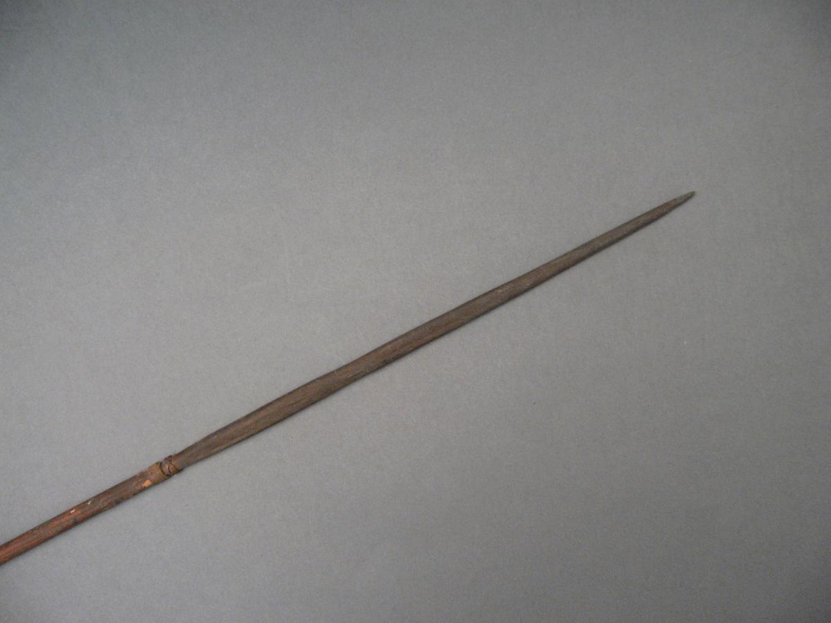 Kétrészes: a nyele sötétbarna színű, hengeres nád, hegye barnás színű, szögletes keményfa. A két rész illeszkedésénél barnás színű fonott gyűrű és háncsfonat van. Díszítetlen.