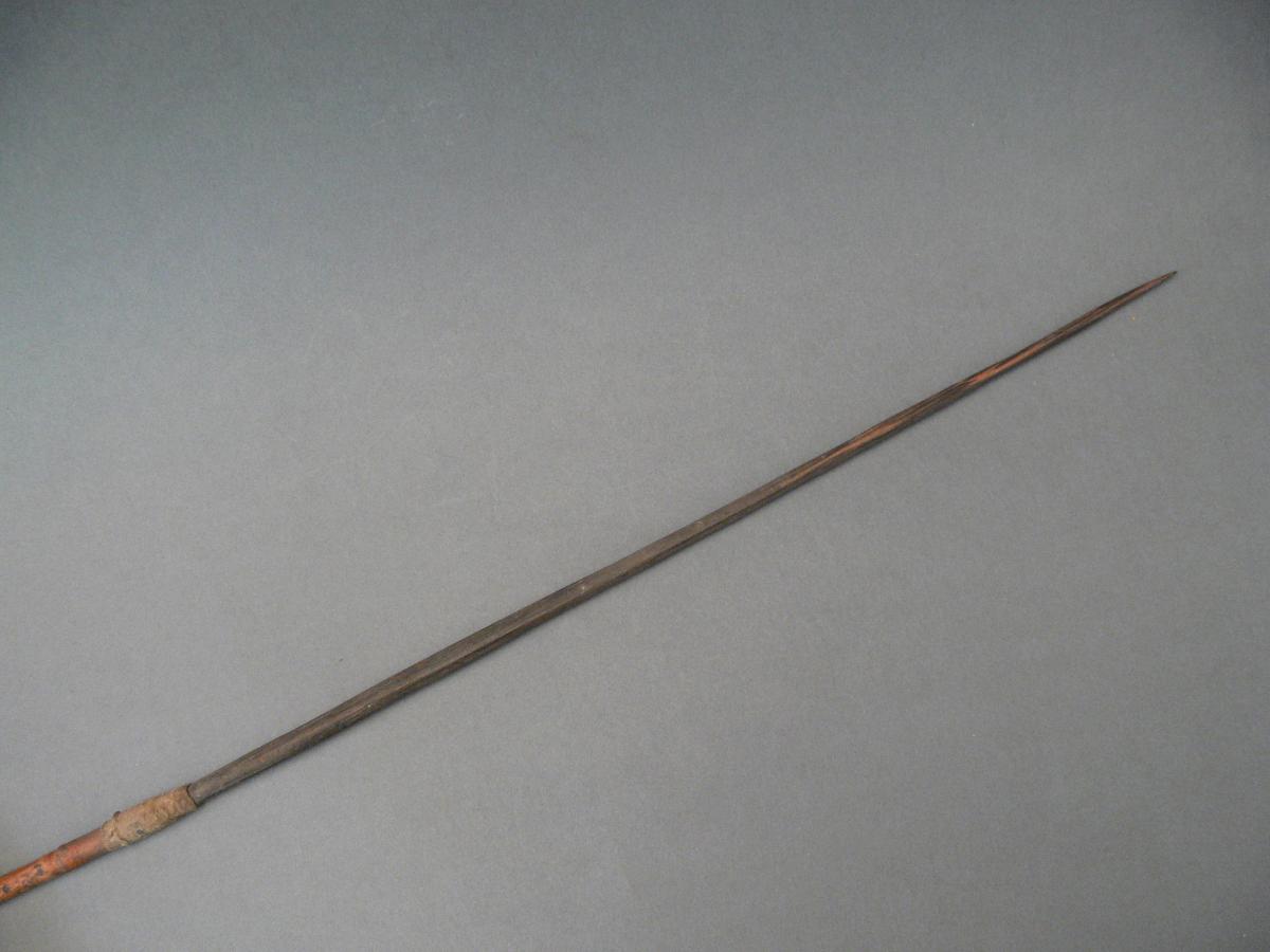 Kétrészes: a nyele sötétbarna színű, hengeres nád, hegye négyélű, feketés színű keményfa. A két rész illeszkedésénél a nyílvesszőre világos színű háncsanyag van rácsavarva. Díszítetlen.