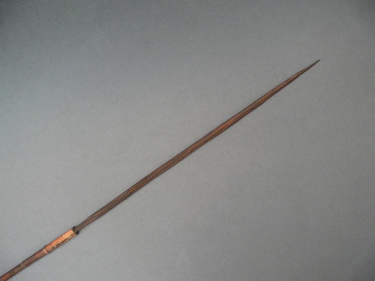 Kétrészes: a nyele sötétbarna színű, hengeres nád, hegye barnás, szögletes, négyélű keményfa. A két rész illeszkedésénél feketés színű aszfaltszerű anyag nyomai látszanak, ez alatt barnás színű, fonott háncsgyűrű van. Díszítetlen.