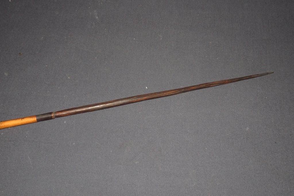 Kétrészes nyílvessző. A nádból hasított szárba keményfából faragott, kerek keresztmetszetű hegyet illesztettek. A nyélbe öt helyen függőleges vonalakból álló díszítőmintázatot égettek. A nyél végén levő hasíték a húrba történő illesztést szolgálta, megerősítése érdekében növényi rosttal tekerték körbe.