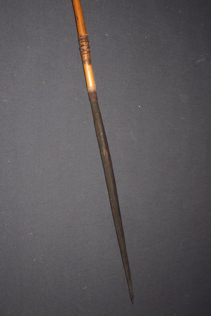 Kétrészes nyílvessző. A nádból hasított szárba növényi rosttal rögzítették a keményfából faragott, kerek keresztmetszetű hegyet.