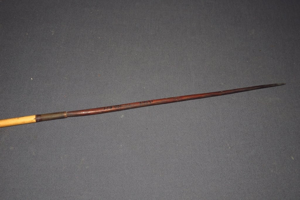 Kétrészes nyílvessző. Bambusznádból készült alsó részébe hengeres keresztmetszetű keményfa hegyet illesztettek. A bambuszrészbe öt szakaszon sűrű párhuzamos vonalakból álló mintát égettek.