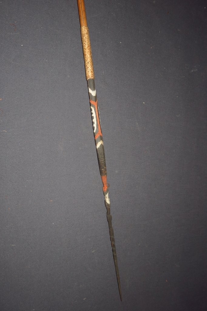 Kétrészes nyílvessző. A hengeres nádból készült szárhoz növényi rostfonattal rögzítették a keményfából faragott hegyet, melybe geometrikus motívumokat, illetve szakákat véstek. A véseteket fehér és vörös festékkel színezték, a bambusz szárba geometrikus mintákat égettek.