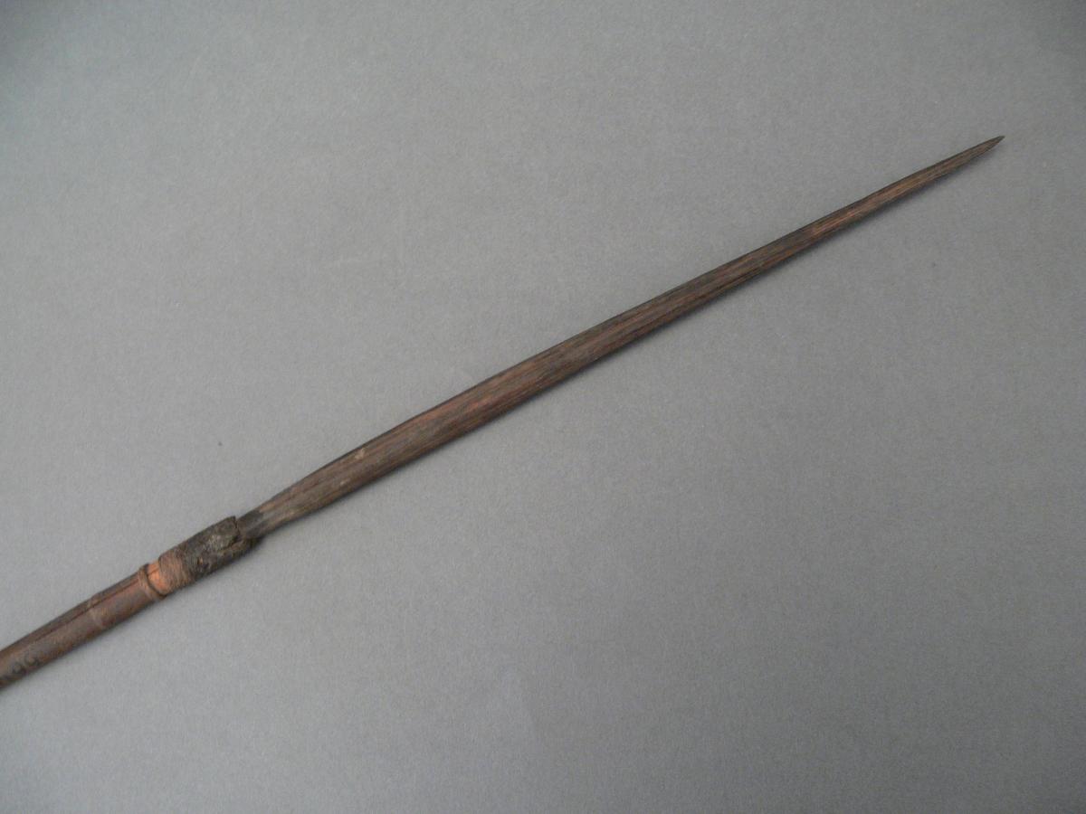 Kétrészes: nyele barnás színű, hengeres nád, hegye barnás színű, négyélű keményfa. A két rész illeszkedésénél aszfaltszerű anyaggal bevont háncsgyűrű van. Díszítetlen. A nyél felső részén repedezett.