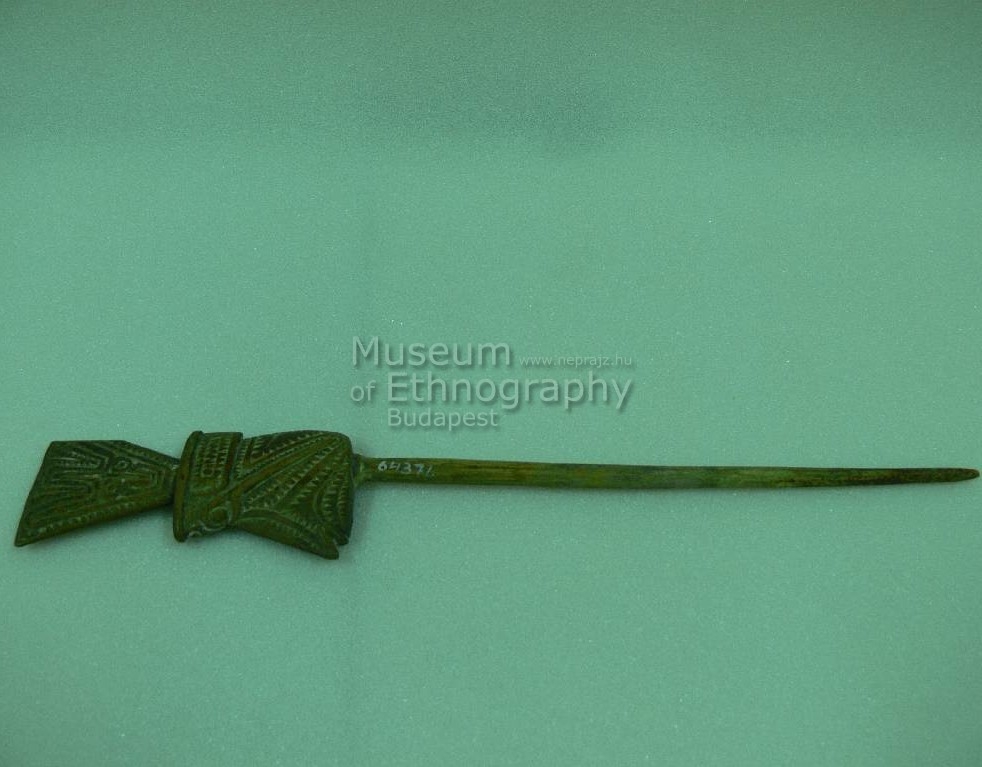 Barnás színű, fából faragott tárgy. Alsó része hengeres pálca, lapos fogórésze stilizált emberfejet mintáz fejdísszel. Mind az emberfej, mind a fejdísz vésett, mészporral fehérített fűrészfogsorral és kígyóvonallal díszített.