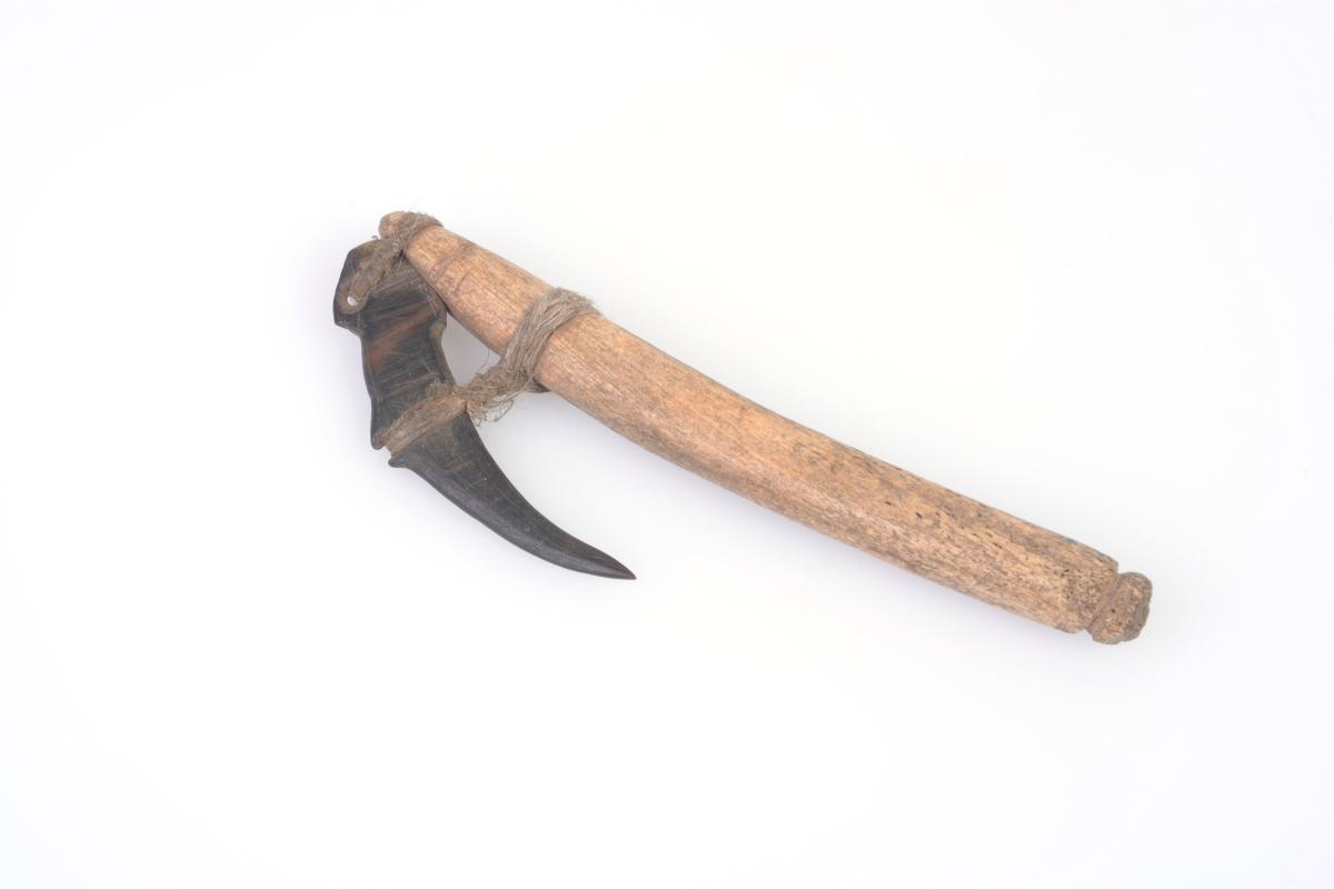Kétrészes: egyik része hengeres, piszkos-fehéres színű, kagylóból készült, egy helyen körbefutó barázdával ellátott; másik része lapos, hegyes, barna teknőspáncélból készített, átfúrt s két helyen bevágással ellátott.A két részt rostkötelék erősíti egymáshoz.