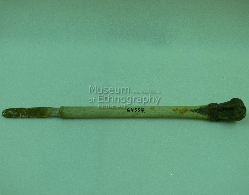 Hengeres fogójú fehéres színű csont. Lapátrésze pedig barna fából készült. A fogó felső részén a csont természetes megvastagodásánál vöröses szinü rostból font gyűrű van, egyébként teljesen díszítetlen.