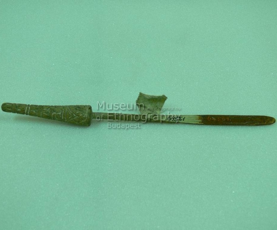 Világos színű fából faragott vékony lapátka, díszes fogóval.