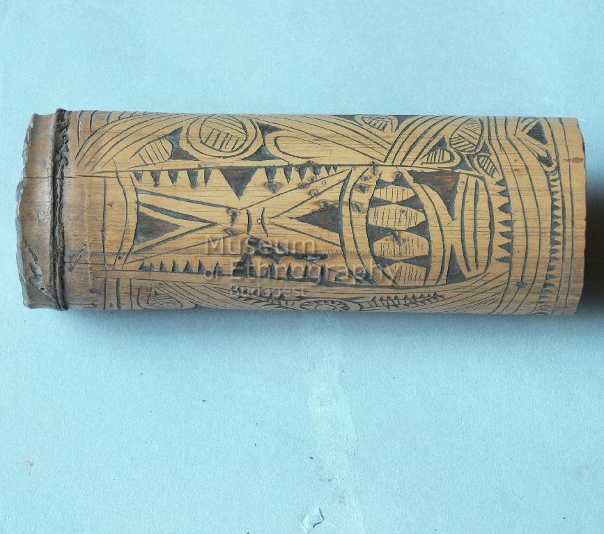 Bambuszból készített, henger alakú tartály, melynek fenekét a bambusz internódiuma képezi. Felső része nyitott. Teljes külső felületét mélyített geometrikus díszítések borítják. Színe sárgásbarna.