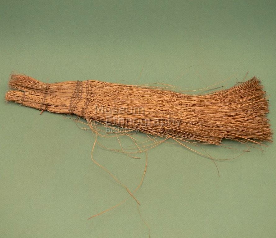 Vékony sallangokra hasított, világos-okker levelek. Alakja megnyúlt téglalap. Egyik végén négy helyen seprőkötés tartja össze . Az alapanyag ezen a részen nincs felhasogatva. A kötés barna rostanyag. Egyik oldalán, az alsó kötés felett három fokozatos lépcsőt alkotva hajlik vissza a hasított levélzet.