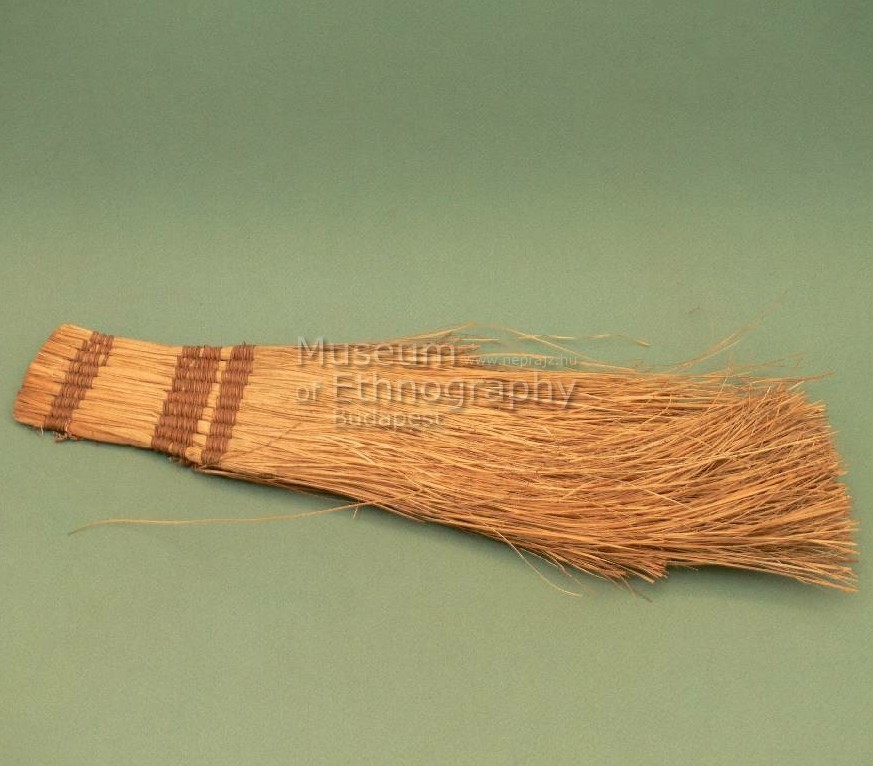 Vékony sallangokra hasított, világos-okker levelek. Alakja megnyúlt téglalap. Egyik végén három helyen seprőkötés tartja össze . Az alapanyag ezen a részen nincs felhasogatva. A kötés barna rostanyag. Egyik oldalán, az alsó kötés felett három fokozatos lépcsőt alkotva hajlik vissza a hasított levélzet.