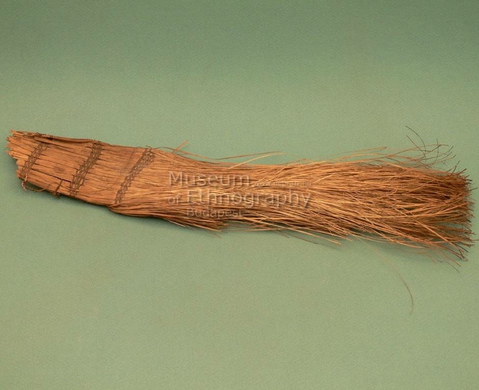 Vékony sallangokra hasított, világos-okker levelek. Alakja megnyúlt téglalap. Egyik végén három helyen seprőkötéssel szorosan összetartott . A kötés barna rostanyag. Ezen a részen az alapanyag nincs felhasogatva. Egyik oldalon, az alsó kötés felett három fokozatos lépcsőt alkotva hajlik vissza a hasított levélzet.