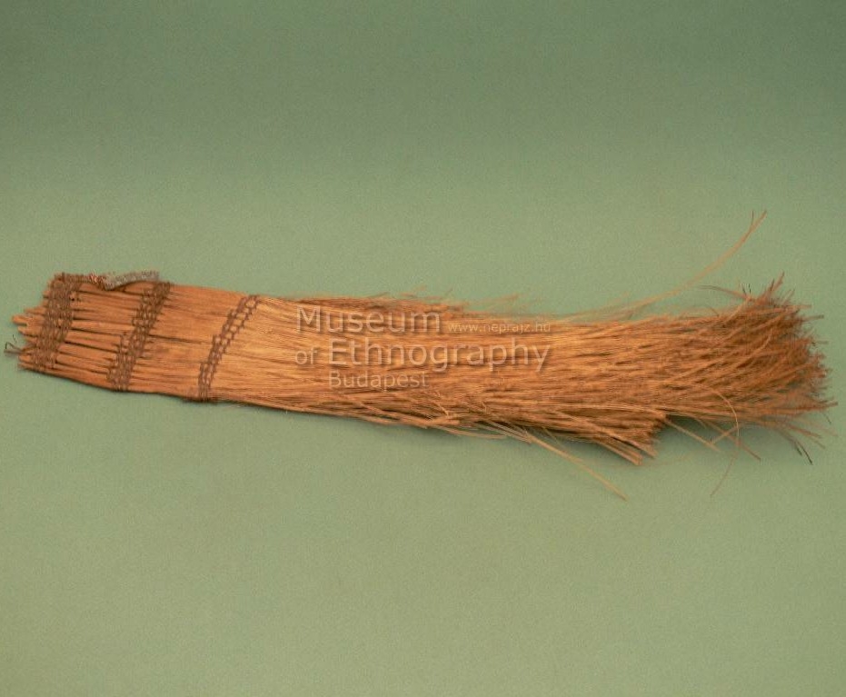 Vékony sallangokra hasított, világos-okker levelek. Alakja megnyúlt téglalap. Egyik végén két helyen seprőkötés tartja össze lazán. A kötés barna rostanyag. Ezen a részen az alapanyag nincs felhasogatva. Egyik oldalon, az alsó kötés felett újabb hasogatott levélzet van átfűzve és a dísz félhosszúságában levágva egyenesen.
