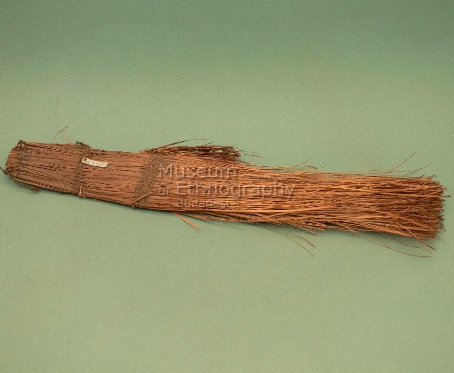 Vékony sallangokra hasított világos-okker levelek. Alakja megnyúlt téglalap. Egyik végén három helyen seprőkötés tartja össze. A kötés barna, sodrott rostanyag. Az alapanyag ezen a részen nincs felhasogatva. Egyik oldalon, az alsó kötés felett háromfokozatos lépcsőt alkotva hajlik vissza a hasított levélzet.