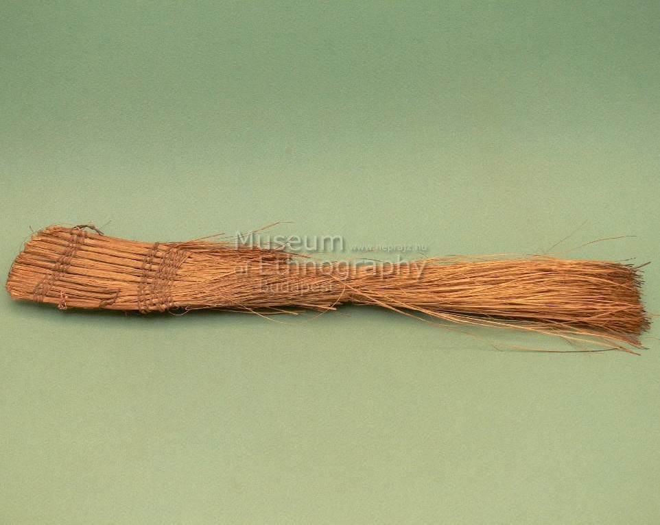 Vékony sallangokra hasított világos-okker levelek. Alakja megnyúlt téglalap. Egyik végén három helyen seprőkötés tartja össze. A kötés barna rostanyag. Ezen a részen az alapanyag nincs felhasogatva. Egyik oldalon, az alsó kötés felett háromfokozatos lépcsőt alkotva hajlik vissza a hasított levélzet.