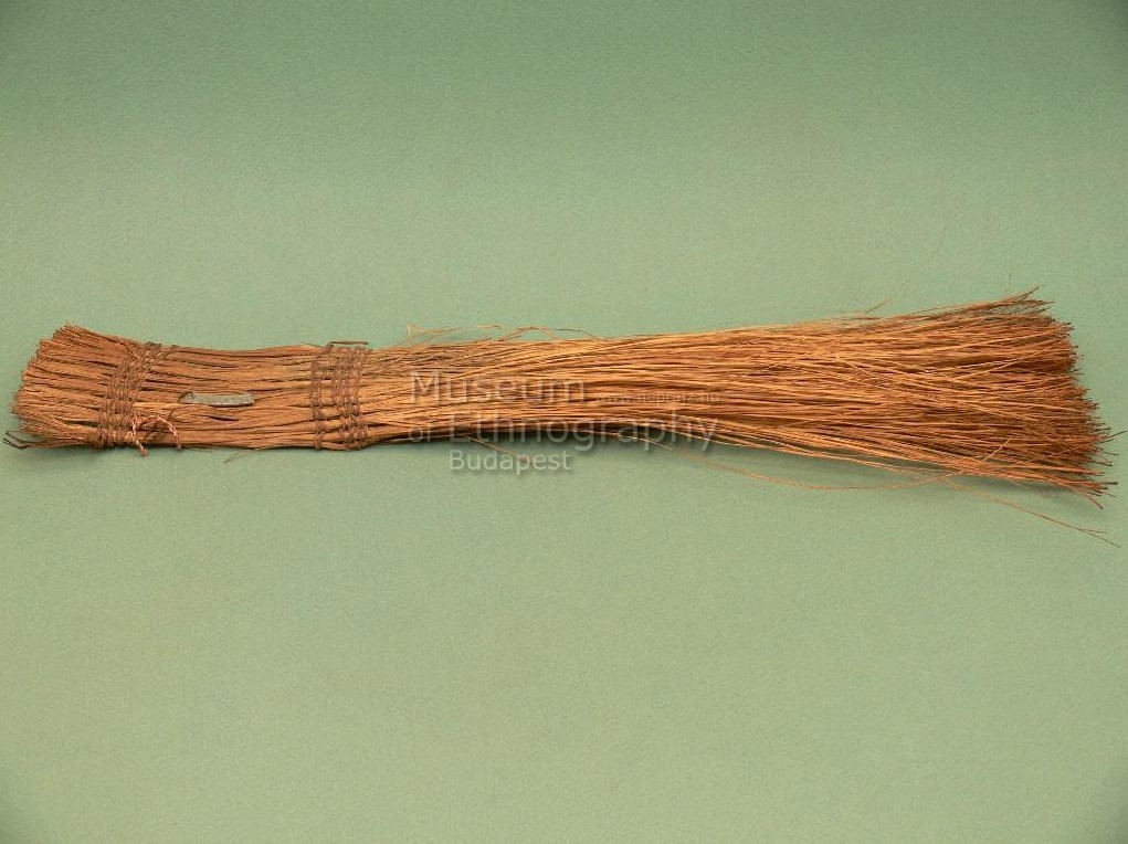 Vékony sallangokra hasított, világos-okker levelek. Alakja megnyúlt téglalap. Egyik végén három helyen seprőkötés tartja össze. A kötés barna rostanyag. Ezen a részen az alapanyag nincs felhasogatva. Egyik oldalon, az alsó kötés felett háromfokozatos lépcsőt alkotva hajlik vissza a hasított levélzet.
