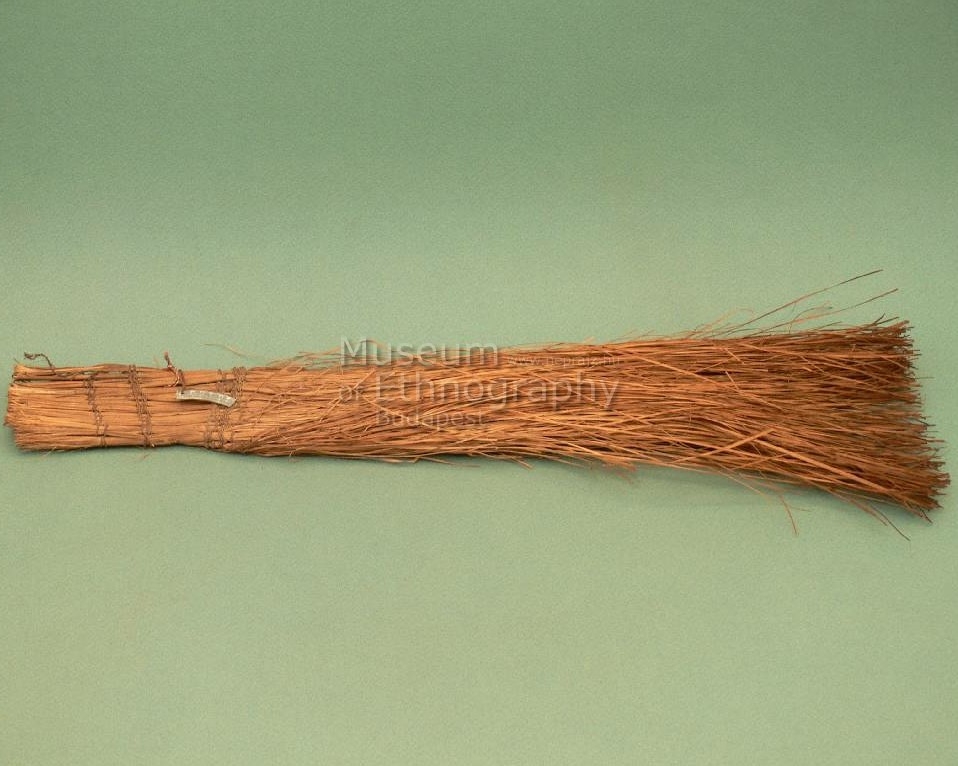 Vékony sallangokra hasított, világos-okker levelek. Alakja megnyúlt téglalap. Egyik végén öt helyen seprőkötés tartja össze. A kötés barna, sodrott háncsanyag.