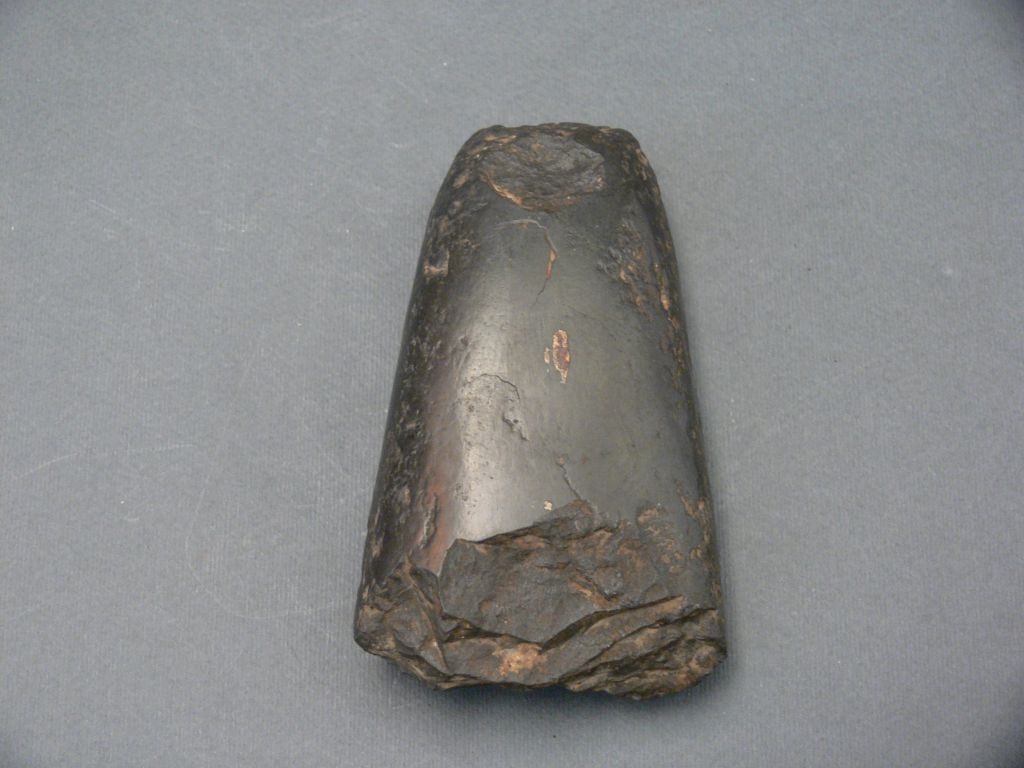 Zöldes színű kőből csiszolt, trapéz alakú, kétoldalt enyhén legömbölyített élű lappal, alul törött éllel. Fa nyele külön van tőle.