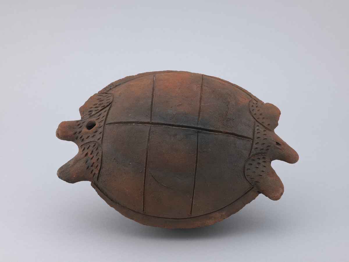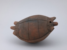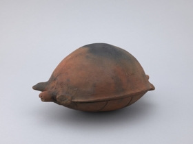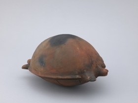 Teknősbéka alakú edény, alsó része erősebben gömbölyű. Ez az oldal teljesen díszítetlen, az átellenes oldalt bekarcolt vonalakkal hat részre osztották, illetve a lábak körül apró bekarcolt vonalakkal díszítették. Két hosszanti oldalán 3-3 kiugró díszítés található, amely az állat lábait, farkát és fejét ábrázolja. Az egyik végénél, e kiugró díszítés fölött kör alakú nyílás szolgál a víz beöntésére.