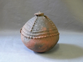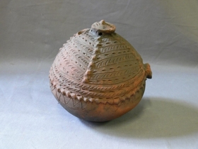 Víztartó agyagedény. Égetett, vöröses színű mázzal bevont agyagból készült. Felfelé kissé elnyújtott gömbalakú, felső végét gombszerűen kiképzett rész zárja le. Ez alatt köralakú, szopókaszerű nyílás, vsz. ivás céljára. Az edény közepén bütyökdísz húzódik körbe, ez alatt hullámvonalas díszítés. Az alsó rész egyébként díszítetlen. Felső részét négy bütyöksor, mely hosszanti irányban húzódik, osztja négy mezőre, a középső bütyöksor fölött még két, kissé kiugró hurkasor húzódik körbe. A mezőket mélyített díszítés tölti ki.