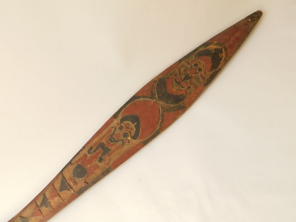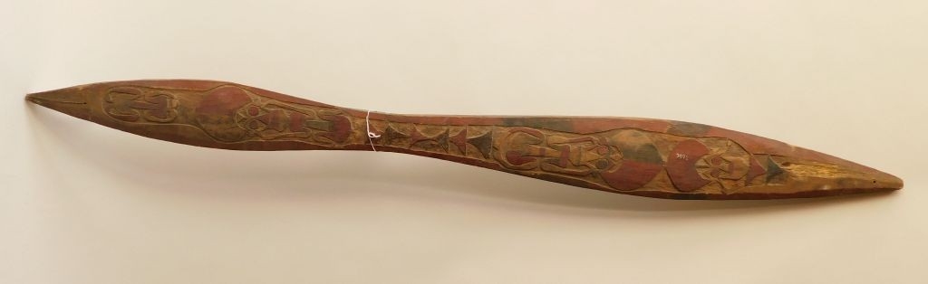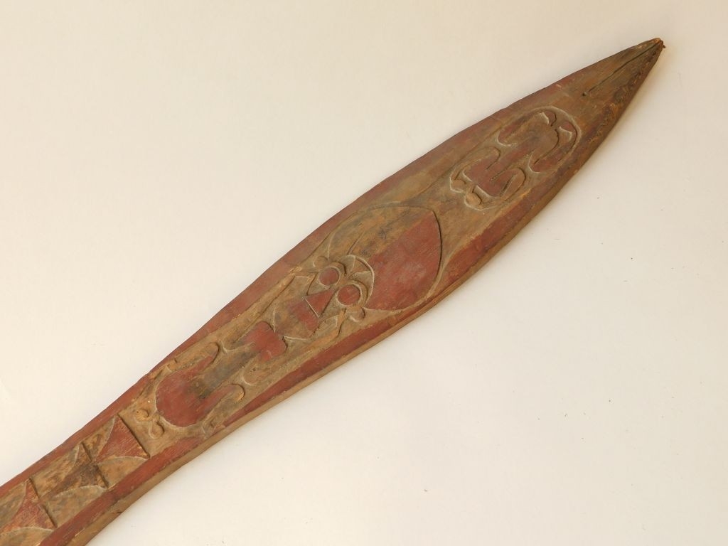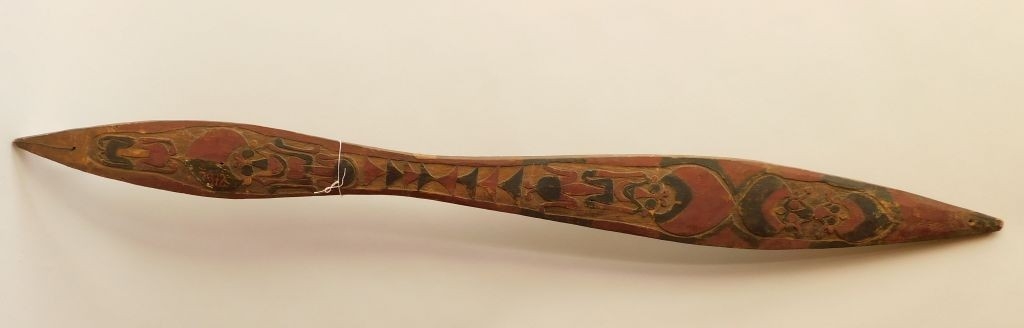 Világosbarna fából készült, lapos, felülnézetben aszimmetrikus, evezőlapát alakú végei különböző méretű nyújtott orsó alakúak, amelyek egy konkáv nyeregfelületben találkoznak a keskenyebb végétől 500 mm távolságra. Mindkét oldalon vésett, vörös és fekete színnel festett, részben figurális díszítés van. Súlya 0,754 kg. PA