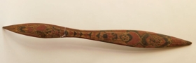 Puha faanyagból faragott, középen elvékonyodó, két vége felé kiszélesedő és csúcsban végződő tárgy. Mindkét felületén magas relifes, stilizált emberalakkal és háromszöges motívumokkal. Vörös-fekete színezéssel.