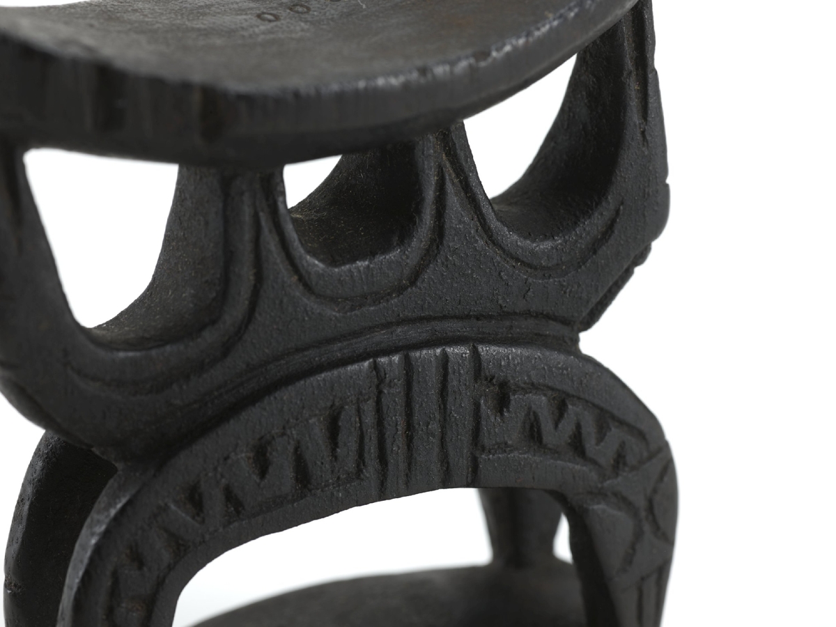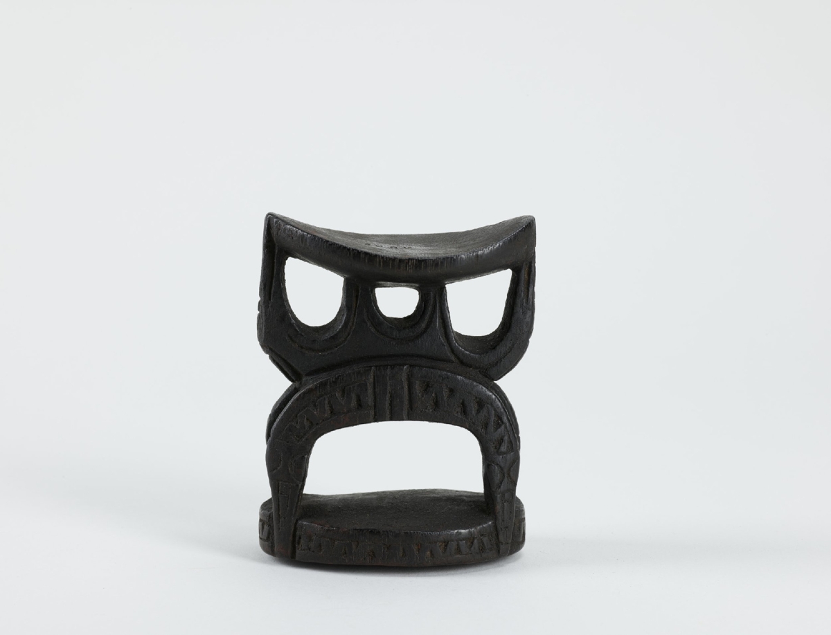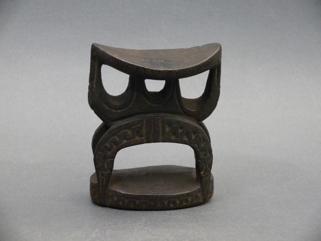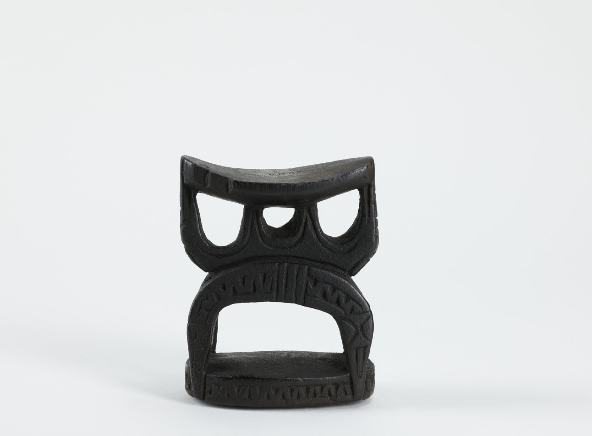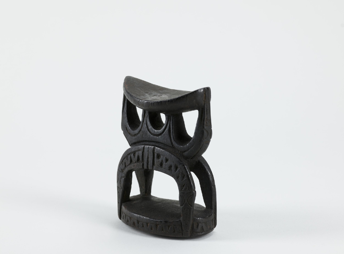 Egy darab keményfából faragott, fekete fejalj. Felső része enyhén hajlott ovális, alsó része téglalap alakú lap. Ezeket félköríves négylábú faragvány köti össze, mely felükkel lefelé fordult kígyókat ábrázol. A lábakon hullámvonalas bemélyítés látható. A félkörívre három félköríves faragvány támaszkodik, nyílásával felfelé, a felső lapot támasztva. Valószínűleg huon-öböli készítmény.