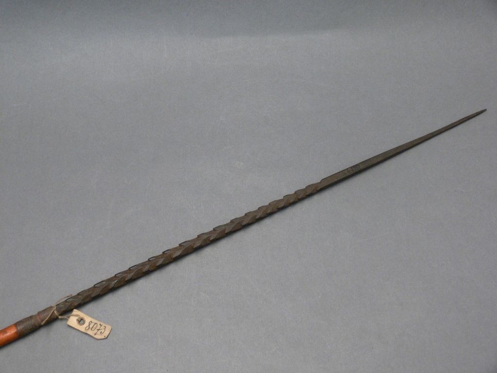 Kétrészes nyílvessző. Szára barna, égetett vonalakkal díszített hengeres nád, melyhez fonott háncsgyűrűvel rögzítették a négyszögletes, keményfából faragott, élein szakákkal ellátott hegyet.