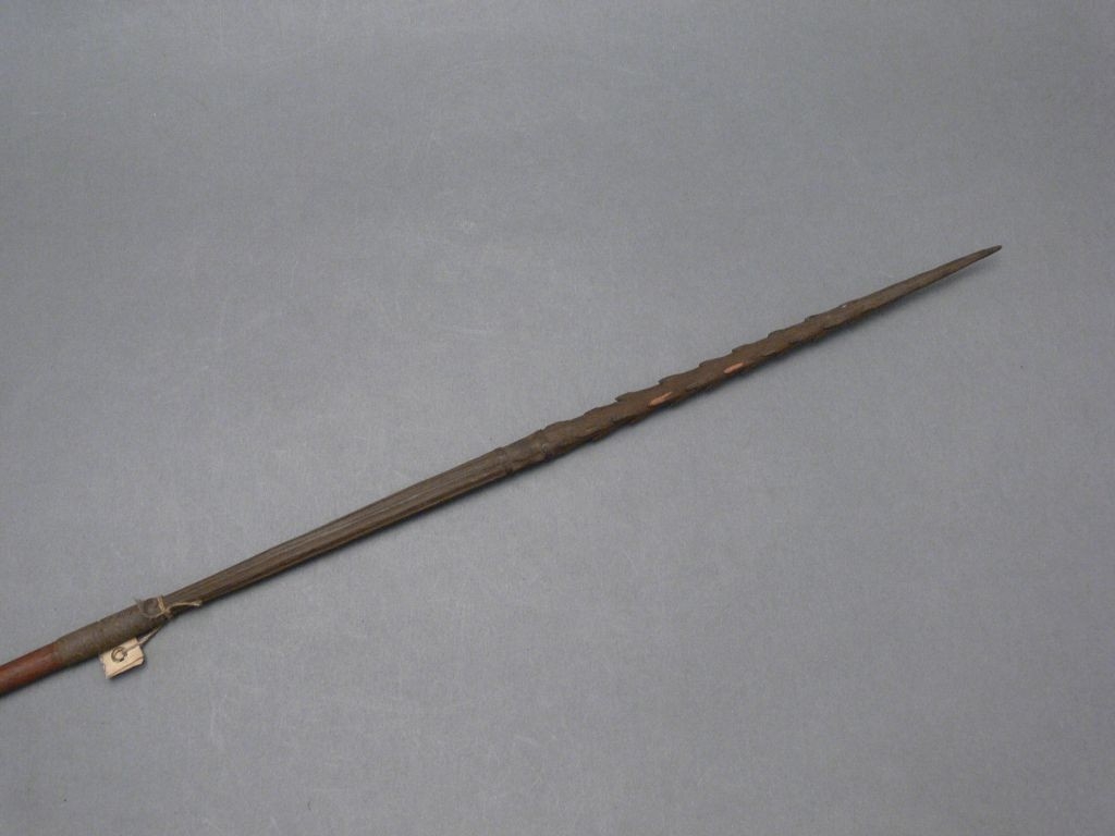 Kétrészes nyílvessző. Szára barna, hengeres nád, melyhez fonott háncsgyűrűvel rögzítették a keményfából faragott, rovátkákkal ellátott hegyet.
