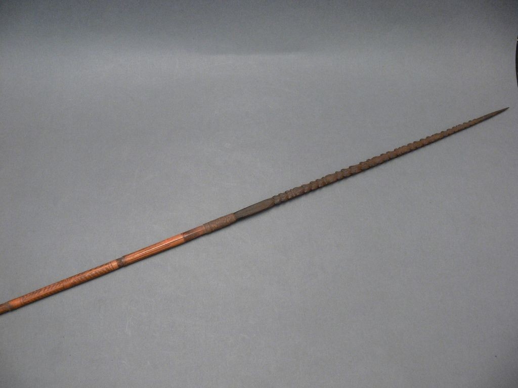 Kétrészes nyílvessző. Szára sárga, hengeres nád, melyhez fonott háncsgyűrűvel rögzítették a négyszögletes, keményfából faragott, élein rovátkákkal ellátott hegyet.