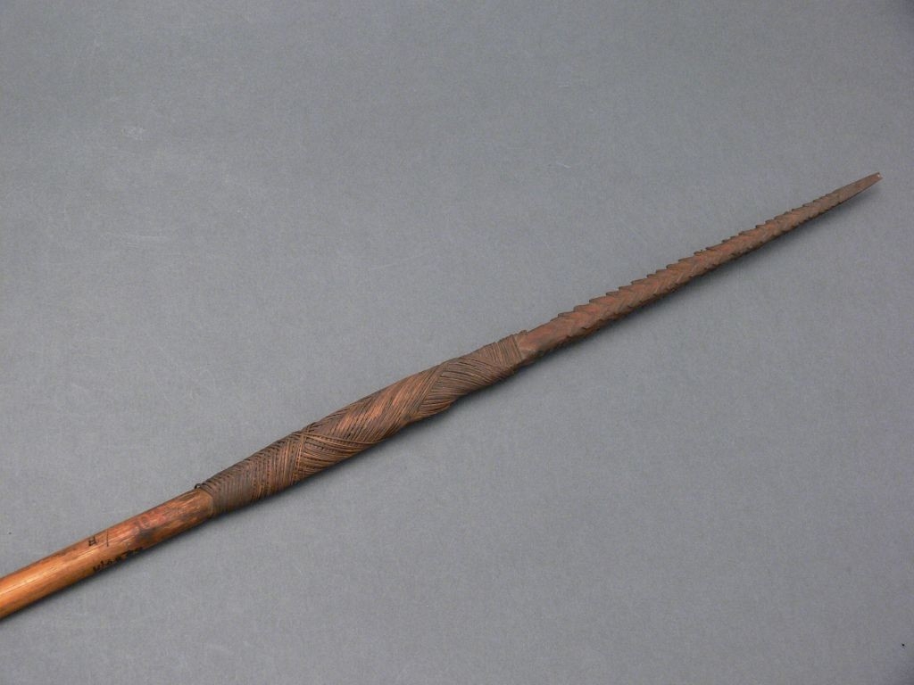 Kétrészes nyílvessző. Nyele sárgás hengeres nád. Hegye szögletes, négy éle faragott szakákkal ellátott keményfa. Finoman fonott 13 cm széles rostfonattal összeillesztve.