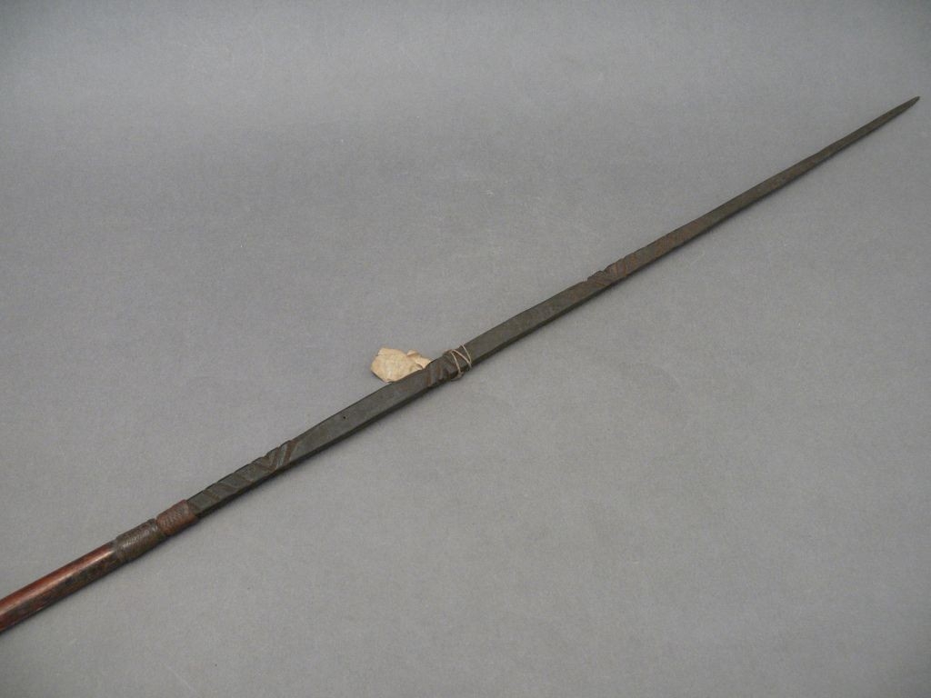Kétrészes nyílvessző. Szára sötétbarna, hengeres nád. Fonott háncsgyűrűvel rögzített hegye négyszögletes keményfa, faragott szem alakú motívumokkal.