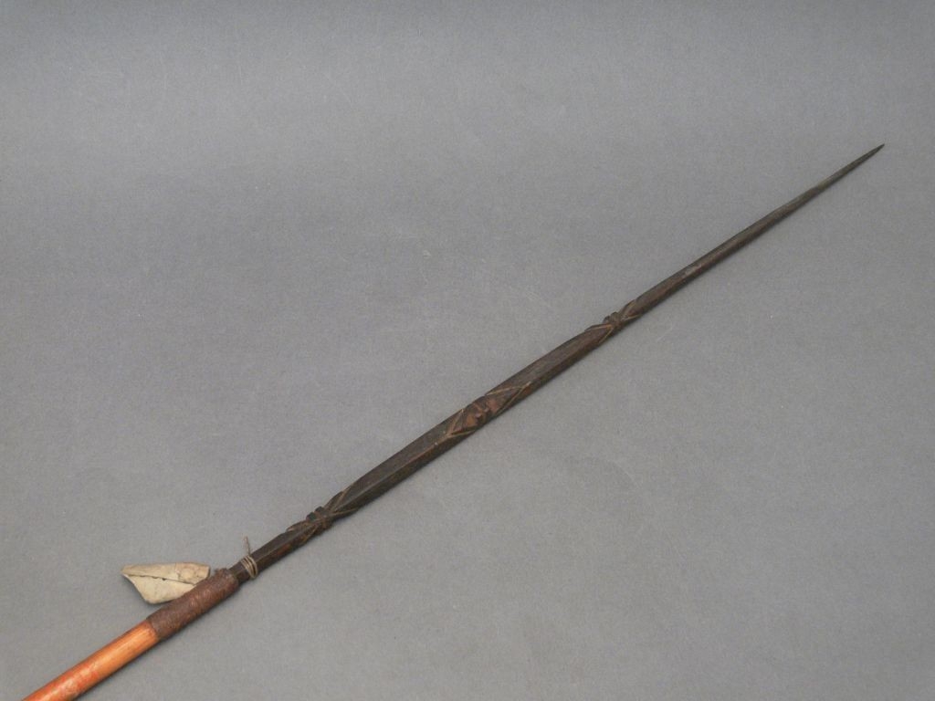 Kétrészes nyílvessző. Szára sárga, hengeres nád égetett vonalakkal. Fonott háncsgyűrűvel rögzített hegye négyszögletes keményfa, faragott szem alakú motívumokkal, melyek között vörös festéknyomok vannak.