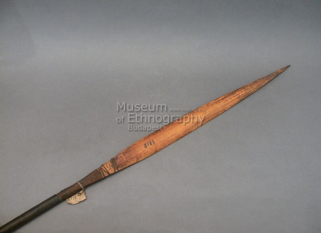 Háromrészes nyílvessző. A bambuszból készült szárba növényi rostfonttal rögzítették a fából faragott, kerek keresztmetszetű középrészt, ahhoz pedig hasonló módon a bambuszból metszett, levél alakú hegyet.