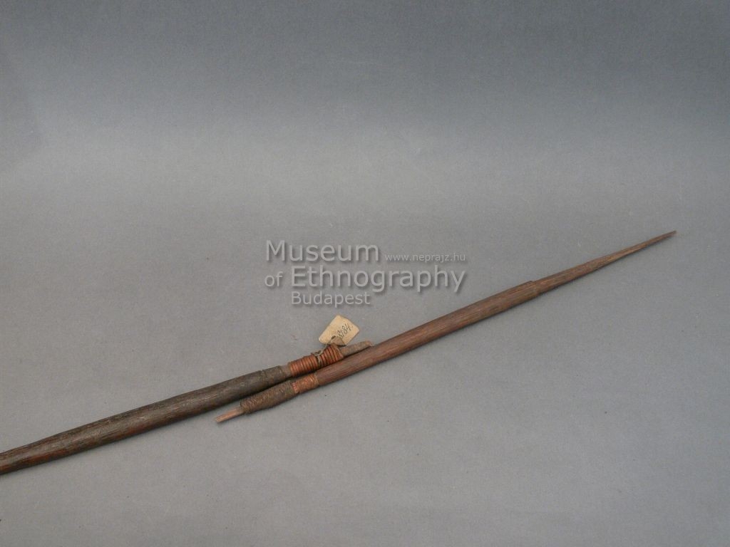 Háromrészes, nyele barnás színű, hengeres nád, égetett vonalakkal és geometrikus mintákkal díszítve, hegye barnás színű keményfa. A középső része vöröses színű hengeres keményfa. A hegy a középrészhez van illesztve, rögzítése több sorosan körültekert rostkötelék és fonott háncsgyűrű szolgál. A középrész és a nyíl illeszkedésénél szintén háncsgyűrű van.