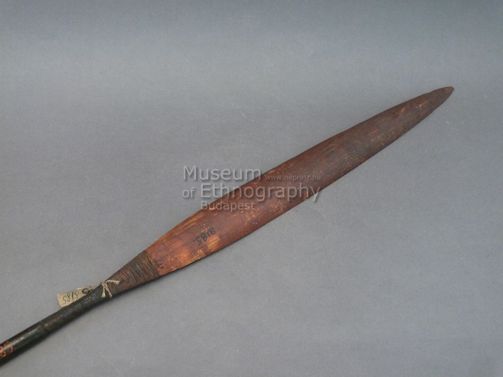 Háromrészes nyílvessző. A bambuszból készült szárba növényi rostfonttal rögzítették a fából faragott, kerek keresztmetszetű középrészt, ahhoz pedig hasonló módon a bambuszból metszett, levél alakú hegyet.
