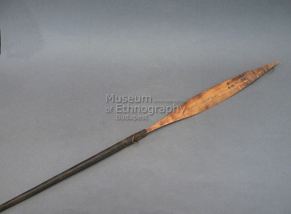 Háromrészes nyílvessző. A bambuszból készült szárba növényi rostfonttal rögzítették a fából faragott, kerek keresztmetszetű középrészt, ahhoz pedig hasonló módon a bambuszból metszett, levél alakú hegyet.