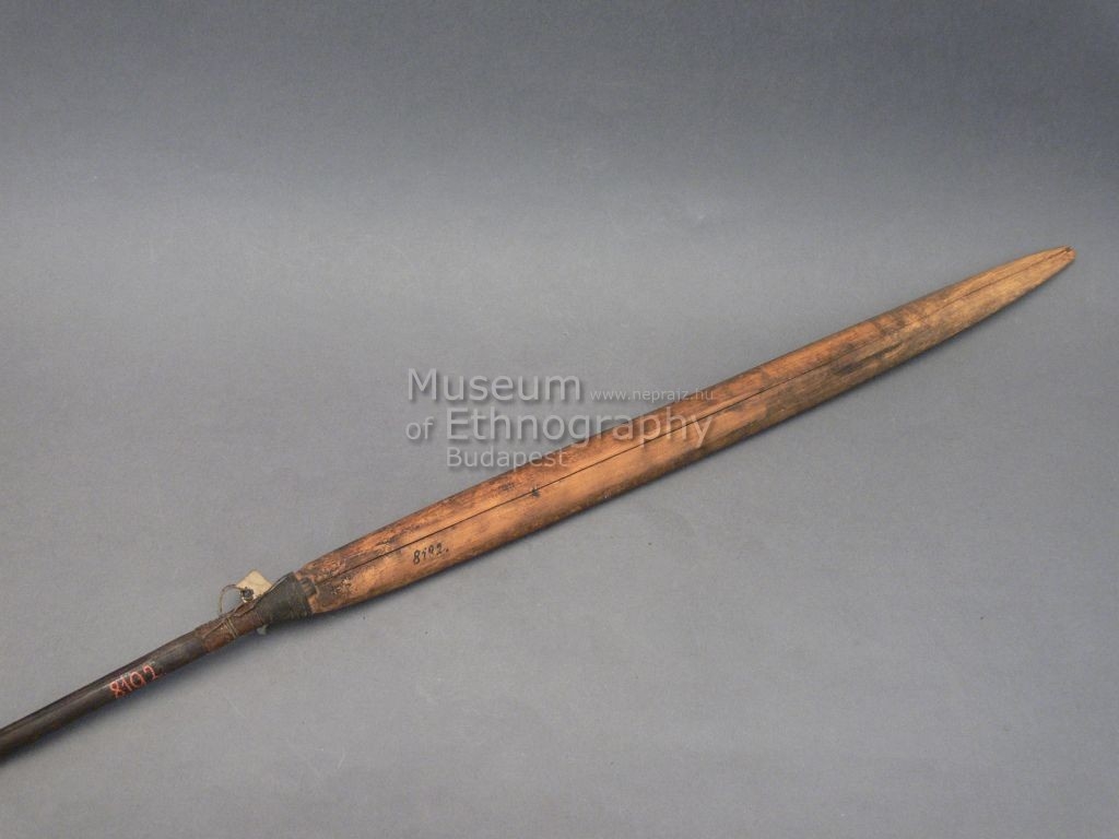 Háromrészes nyílvessző. A bambuszból készült szárba növényi rostfonttal rögzítették a fából faragott, kerek keresztmetszetű középrészt, ahhoz pedig hasonló módon a bambuszból metszett, levél alakú hegyet, melynek belső oldalán már csaknem teljesen lekopott fekete festés húzódott végig.