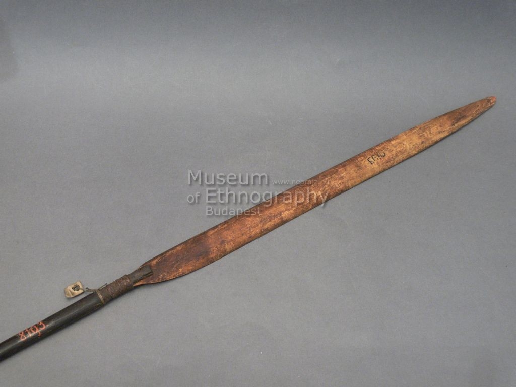 Háromrészes nyílvessző. A bambuszból készült szárba növényi rostfonttal rögzítették a fából faragott, kerek keresztmetszetű középrészt, ahhoz pedig hasonló módon a bambuszból metszett, levél alakú hegyet, melynek belső oldalát fekete festés díszíti.