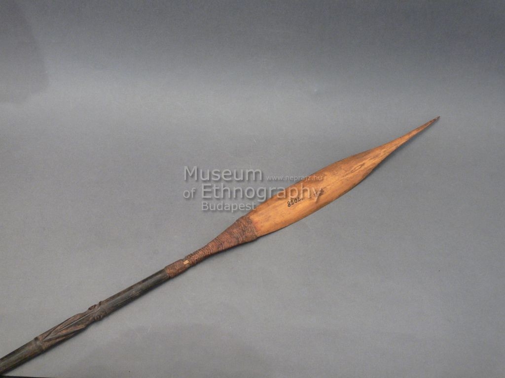 Háromrészes nyílvessző. A bambuszból készült szárba növényi rostfonttal rögzítették a fából faragott, kerek keresztmetszetű, faragásokkal díszített középrészt, ahhoz pedig hasonló módon a bambuszból metszett, levél alakú hegyet.