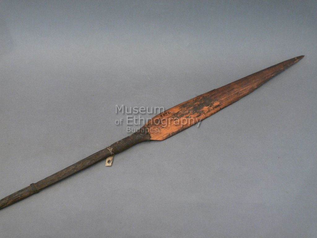 Háromrészes nyílvessző. A bambuszból készült szárba növényi rostfonttal rögzítették a fából faragott, négyszögletes keresztmetszetű középrészt, ahhoz pedig hasonló módon a bambuszból metszett, levél alakú hegyet.