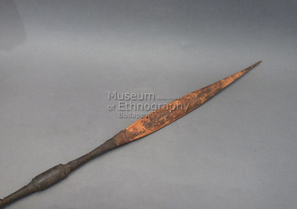Háromrészes nyílvessző. A bambuszból készült szárba növényi rostfonttal rögzítették a fából faragott, kerek keresztmetszetű, közepén hordószerűen megvastagodó középrészt, ahhoz pedig hasonló módon a bambuszból metszett, levél alakú hegyet.