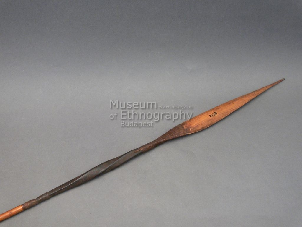 Háromrészes nyílvessző. A bambuszból készült szárba növényi rostfonttal rögzítették a fából faragott, kerek keresztmetszetű, csavartan megfaragott középrészt, ahhoz pedig hasonló módon a bambuszból metszett, levél alakú hegyet.