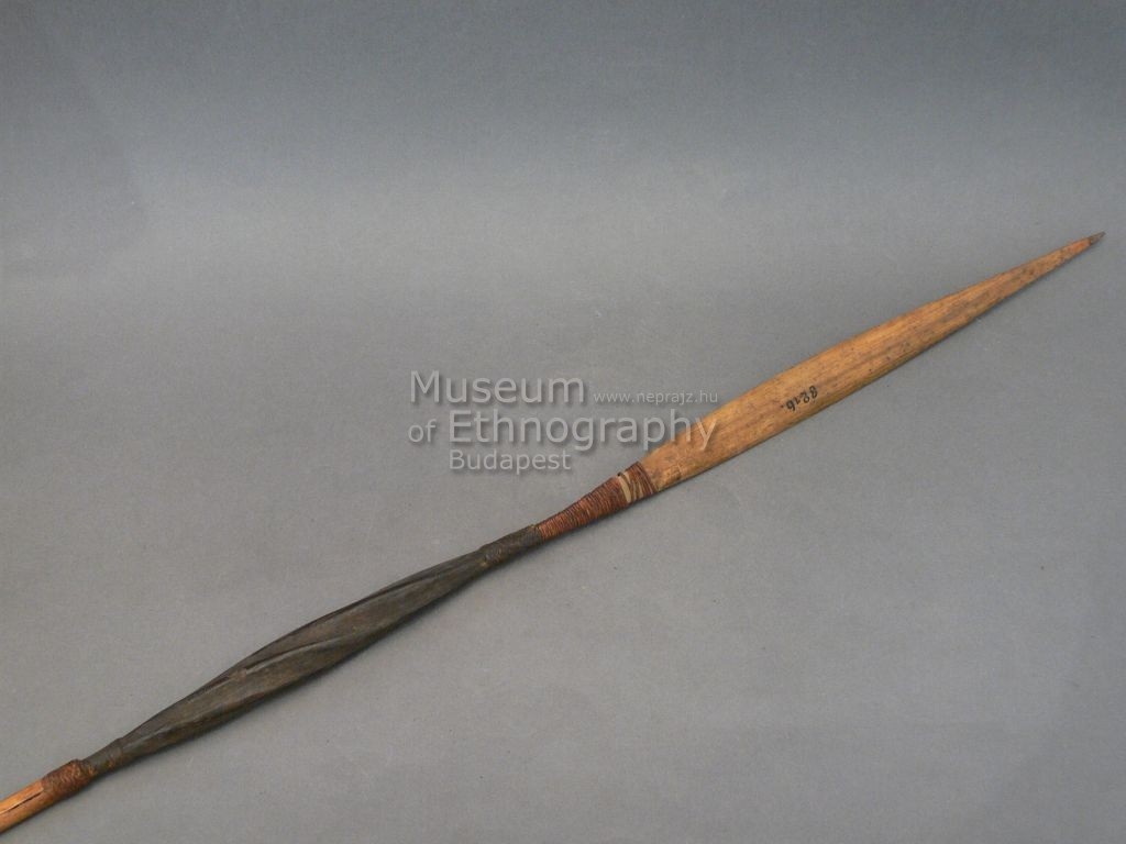 Háromrészes nyílvessző. A bambuszból készült szárba növényi rostfonttal rögzítették a fából faragott, kerek keresztmetszetű, csavartan megfaragott középrészt, ahhoz pedig hasonló módon a bambuszból metszett, levél alakú hegyet.